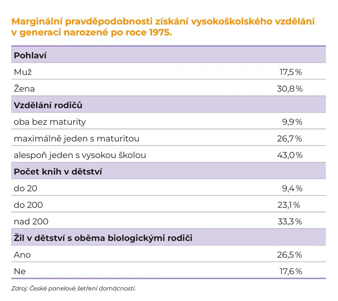 Klíčem k vysokoškolskému titulu je v Česku rodinné zázemí, ale také okolí, v němž děti vyrůstají. Rozhodující význam má vzdělání rodičů, ale také stabilita rodiny. Pokud tedy například rodiče nejsou rozvedení, je šance, že jejich dítě úspěšně absolvuje univerzitu, vyšší. Dospívání v lokalitách s vyšším podílem vysokoškoláků šance na absolvování univerzity výrazně zvyšuje, naproti tomu vyšší nezaměstnanost v místě sama o sobě překážkou není. Ženy mají více než dvojnásobné šance vystudovat vysokou školu než muži. Vyplývá to z aktuálně zveřejněné studie Národního institutu SYRI, která zkoumala jak rodinné a rezidenční podmínky v dětství šance na vzdělávání formují.